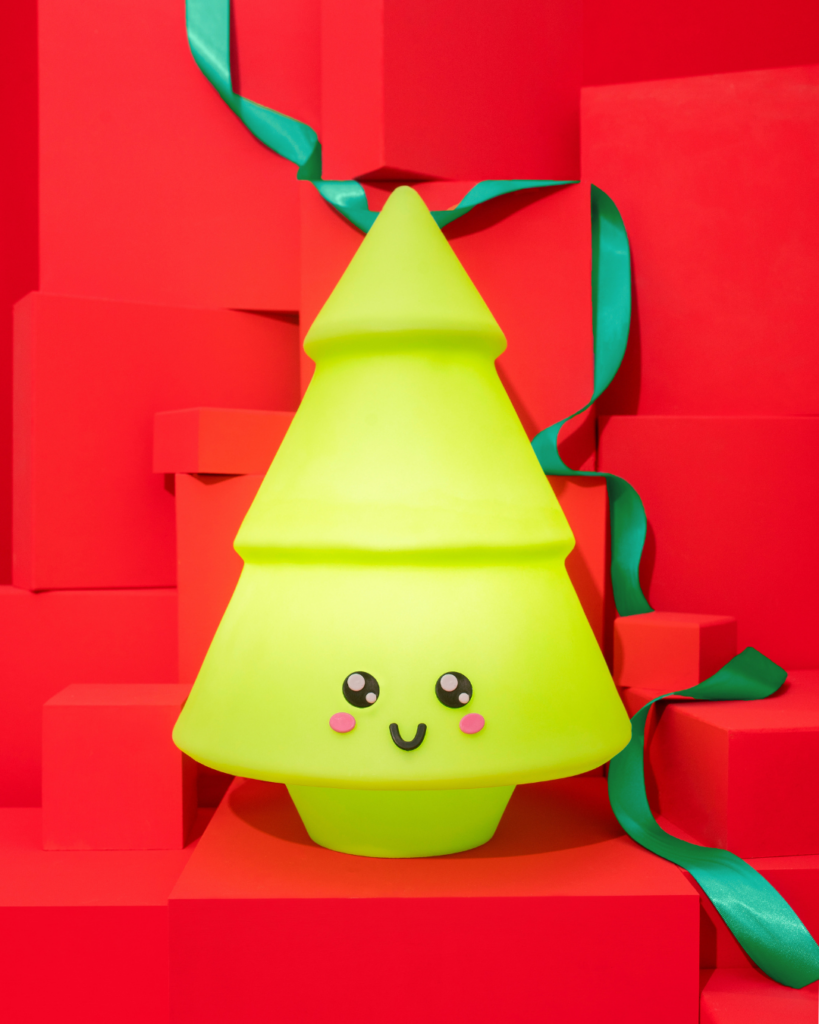 A nossa Luminária Árvore de Natal é uma versão moderna, iluminada e cheia de personalidade do símbolo mais clássico do Natal. Tem essa versão com carinha fofa e outra que pode ser customizada com desenhos ou palavras (desejos natalinos, por exemplo).