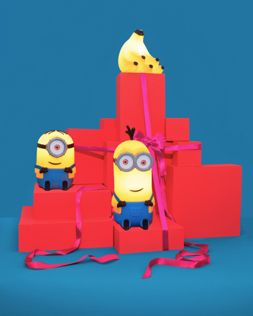 Bello! Para tuuudo, é Natal! E Natal tem que ter: banaaaaanaaaaa! E Minions, claro! Olha que divertida esta Árvore com o Stuart, o Kevin… e, no ponto máximo, estrela da vez, Luminária Cacho de Banana!