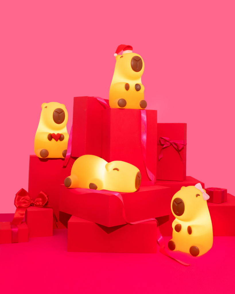 Pra começar, Árvore de Capivarias! Haha, sim, perdoem o trocadilho, mas não tinha como a gente não aproveitar. É que com a capivara mania lançamos muitos modelos fofos desta luminária super queridinha, e se você juntar elas com caixas de presentes pode criar uma árvore com espírito leve, engraçado e um clima de meme que a gente tanto ama.
