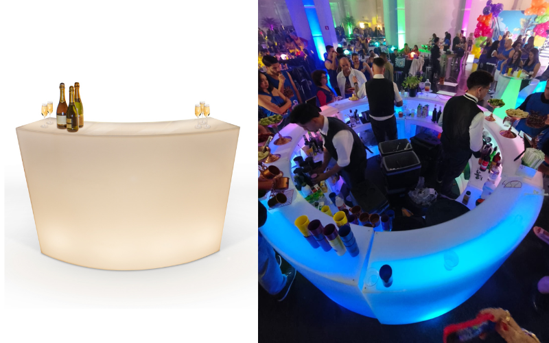 Pra começar, nosso Bar Iluminado modular, o ponto de encontro oficial de qualquer celebração, que deixa claro: ali é onde está o brilho.