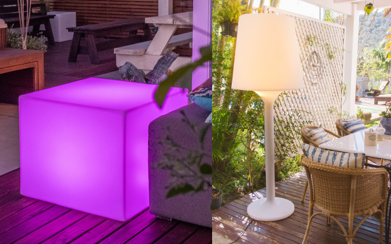 Pufes e bancos iluminados, tanto em versão com fio como em LED, garantem um cantinho pra sentar e descansar, sem perder o brilho. Enquanto isso, a Luminária 190, elegante, imponente e sem fio, pode iluminar as mesas, um cantinho, ou fazer um caminho no jardim.